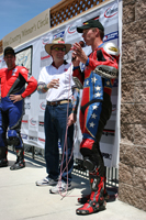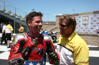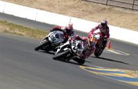 We went into Sunday a little shy about the new workload we had taken on. Four races on two different bikes is a helluva challenge. First up was Open Twins. We started on pole, which at Infineon means you're lined up next to a wall which is on your left, and then you have four other bikes to your right which are all aimed at the end of that very same wall. Since turn one is a left hander you've either got to beat them all to the end of that wall, or you're getting shut down and sent back to somewhere around tenth. In each of the THREE starts this Open Twins race took to complete (two red flags caused the re-starts), our 749R made it to the end of the wall first. But just because we took the hole shot, this didn't mean we were suddenly on easy street - apparently - because Craig McClean on another 749R came under us going into turn two on the first two starts, and then Bud Anderson threw it up underneath us on the last re-start. I guess I need to work on that section.....?