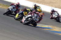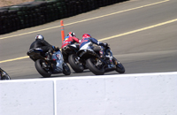 Knowing we had a real "Dry clutch" now, we went into the race with good confidence. It's amazing how different the 600's sound on the line as they await the drop of the green flag. It's almost deafening being surrounded by these high pitched howling bikes, as just about all of their motors stand there bouncing off their rev limiters. We kept our composure, and stuck to our typical launch routine - one foot on the rear stand spool, chest over the tank, finger on the brake, and clutch lifting the seat as it burns. In what felt like an instant in time our 749R came to life with an attitude I've never experienced before. Surely this was one of the best launches we have ever gotten. We went from 22nd place to fifth place by turn two (which is about 300 yards). From there, and before the end of lap two we had made it to third. With the leaders still in sight and our new DynoJet Quickshifter installed, all we had to do was keep it pinned and click up-shifts. Boy does this save loads of time and energy. It definitely made us faster, and by lap three we were right on the leaders - Jeff Tigert and Bobby Fong. We got a real good drives out of our brand new 205 Dunlop slick, which on one lap put us right in the middle of a shoulder to shoulder 600 superbike sandwich on our way up the hill toward seven. No kidding, the three of us were elbow to elbow, throttles pinned wide open, banging through the gears.... And so the challenge was on. "Who's gunna be the last one to brake...?" Surprisingly I think it was us who got into the brakes last, as we nosed our way toward the tight right hander - still in the middle and just barely in the lead. But Tigert was still homing in on our inside as we headed for the apex. I like Jeff, so we gave him a few feet off the apex (to be extra safe), and sure enough he took it like a dog takes to a hefty beef dinner bone. But everything was cool as I knew where we were strong, and the race was still young. An instant later the red flag came out and we were instructed to stop on the track. We all let-up, and slowly I rolled to a stop next to Jeff, with Fong on the opposite side. In a moment the rest of the 600 field rolled up and everyone shut their motors down. As Jeff and I celebrated the