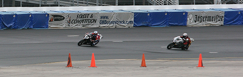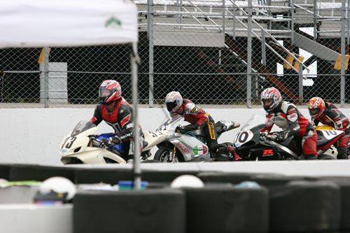 - Heavyweight Superbike - We had a team mate when we raced on the east coast. His name was Tommyboy Eckfeldt. We beat him every weekend. Keep in mind, though, that you're supposed to beat your team-mate every weekend - before you beat anyone else. But we also helped Tommy every weekend. He was an up and coming guy on Ducatis when we lived back in NY. Good rider, hard worker. He wanted to learn a lot, and we helped him any way we could. Tommy's father, Grant, supports their Ducati race program with everything he's got - weekend in and weekend out. When we left three years ago, Tommy battled hard just to make the podiums that we used to rule. But that was three years ago. And times have surely changed since then... Tommy has a 999R now, and he wins a lot. It seems three years without us has worked out well for he and his Dad. Still, though, they welcomed us back with open arms. Although I do have to admit, Tommy did threaten he was gunna' wipe the track with our ass this weekend. I didn't really know how to take that. I was glad to see him confident, finally, but we felt pretty good as well. What should I have done? Threaten him back? Talk a lot of smack? Get into his head? Or just let things play out...? As it turned out, just like the old track felt natural again, so did being Tommy's team mate. We ended up helping him iron out the set-up on his 999R, which he had been struggling with all year. He complained the front end pushed, we sent Joey Israel over to help him. He had no traction, we looked into his swingarm angle. When we noticed the zip tie on his forks was pinned at the stop, we told him. When he responded by saying "I know, I know. It's always like that." We made him get off his ass and get them re-sprung. But still, even though our communication was open, when it came to riding, Tommy was very different out there. We used to go out in practices together. Now he hid from us. Now he went out before I even had my helmet on. And he was pretty tight lipped about things when we got back to the garage. There was definitely something strange in the air. Not Tracy, Derek, or myself could put our finger on it - but if you took either Tommy or us to the side and asked, we both would have admitted "The fight was on." Tracy stood on the hot pit wall for our first race (Heavyweight Superbike), next to Derek, and next to Grant. Emotions were peaked, nerves were highly visible, and the sound of the heavyweight superbike field lining up ran through everyone's blood like electricity. We were gridded on the 4th row. Tommy was on the 2nd. He's run strong in this class this season, with two wins under his belt for the year. We were nobody to most of the guys we lined up next to. Just a strange sounding silver bike that looked like a disco ball, and a foreign rider with his left toe jammed on top of his swingarm spool. We got a good launch and quickly made our way into third by using an old trick through turn one - keep it wide open till your nose bleeds, then jam it up the inside of everyone going into two.. It worked very well. On the brakes going into turn three we made our way into second. Our 749R was up to its old tricks again - taking on the big bikes in a class it has no business running in - and doing it with style.
