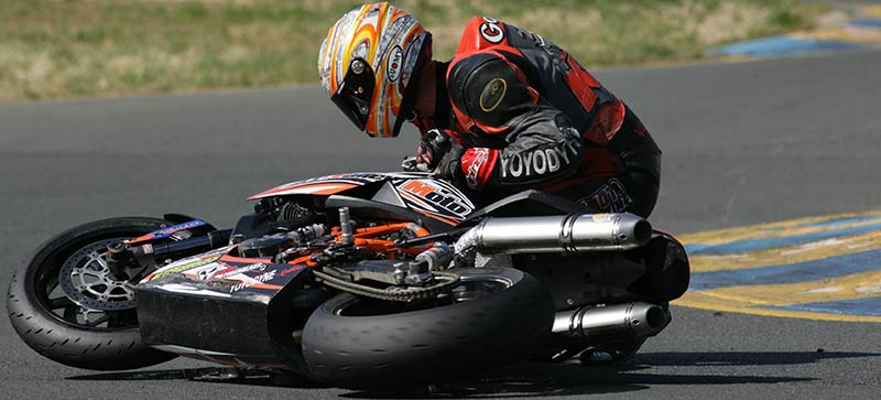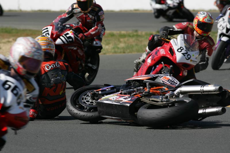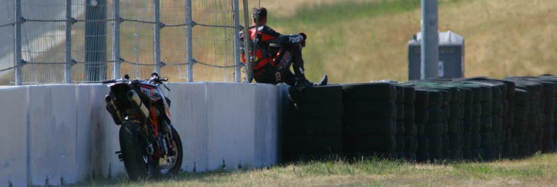 With so few laps at speed yet, and so much progress made by now, all I saw were green lights on the heads up display of our Suomy. We were real good out of 2, turning tight over the crest of 3a, and jamming over the wheelie bump heading for 9. Life was getting good again, but then we hit the deck in a perplexing way in turn 3. I wasn’t on the brakes, I hadn’t just turned in, we were perfectly on line, and we were PAST the apex. Suddenly, and with no warning, our front end washed out and the bike lay down on my left leg while we slid up the hill into the gravel just under the flag station? WTF is that about? Once back at our pit we all decided that our favorite front tire may have finally had enough. After all it saw us through each of our Buttonwillow races, two full days at Laguna, all day Friday, and now some of Saturday. OK my bad, time to pony up. We never made the afternoon practice.