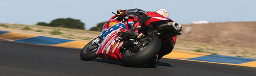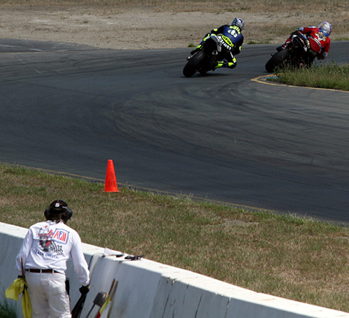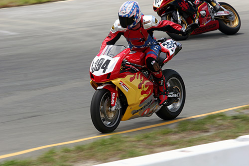We've struggled these past two weeks, to get the parts we needed to re-build our 999R. Finally we had them this past Thursday night. So Friday began with Mike Harmon working from fourteen plastic bins, re-building the motor from the ground up, against all odds. Dennis and I took the easy job, going over the 749R. Only the 749R was ready for Saturday practice, so we ran that all day. Dennis stayed back with Mike and they both put in a huge effort to finish the 999R for Sunday. In our rush to build the bike, one connector didn't get totally locked in place, so we only made it to the chicane before our only practice on a very strange feeling motorcycle, ended way too soon. We only enter 750 superbike to use for practice, and only actually run it when we really need it. Considering we had not one complete lap on the big bike yet, we ran it. Mike ordered me to finish in the position we started in - third row, tenth spot. "Just break the motor in, let the rings seat, check the bike, come in if you need." They had a running bet I wouldn't be able to control myself, but in the end I did. Tooled around mid pack, until while going into the esses I felt some big vibrations going on. I looked up and the corner workers weren't falling over, so I knew it wasn't an earth quake. This was the new motor checking out, so we rolled into the chicane and parked it at about half way. This bike was done.