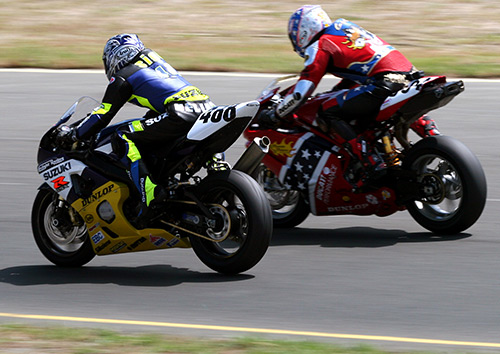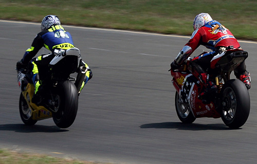 FP began with a crappy start by me, but it really didn't matter a whole lot because everyone ahead of us would have gotten there by turn seven anyway. We just got down and did the best we could to keep them in sight. Surprisingly they stayed in sight for quite a long time. We struggled with the rear tire a bit on drives out of the turns, and on lean angle. This little bike can lean over and wrip around a turn like a demon on the right compound tire, but this wasn't the right compound tire so every time we really got down there it stepped out. In a few laps I began to hear a howling four cylinder just behind us in the carousel. I could tell by the pitch it wasn't a 1,000, so from very early on I knew exactly who it was. I really had no idea how fast Chris's bike is, so I tried real hard to get the hammer down early getting out of the carousel. We struggled exactly there in the ama FX race, which cost us some positions going into turn seven, so I knew this was going to be a weak spot for us again. Two times in a row I heard him howling behind us through there, so I was really pushing the front all the way around. When I dropped the hammer again the rear broke loose and my inside foot dragged on the ground while I collected the bike again. All in all it was just an instant of time before we were back in it, but that was enough to lure Chris in for a pass going into seven. I thought, "Oh crap, here we go again. He's gunna come up the inside, I'm gunna give him room - follow him around and out of seven - and then we can hope again ...........just like the national" Just then, something woke me up. I guess it was Chris. He drifted into that turn from the inside line and had to hang it just a pinch wide mid turn, so I nipped him right back underneath. That 749R really does have amazing roll speed in a corner, so we got to lead again through those esses. I'm not exactly sure on the order of our passes, but I think he out-broke us into the chicane just after that. He goes into that chicane like a nut. Doesn't even need a rear tire on the bike until just before he turns in. It's sick. So he lead the next lap until we both ran into the carousel again. I have to say it again, that little Duck can corner. He ran through there on a line that was a little wider than we could, so at about mid corner we came by on the inside and powered out - making the pass stick.