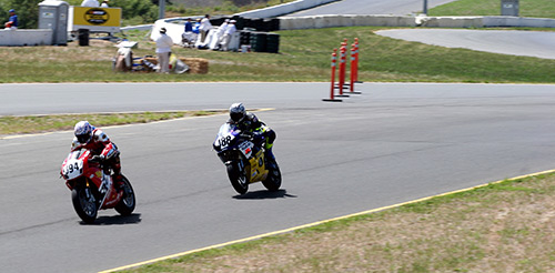 I don't know if it was this lap or not, but Chris shot by on the brakes going into seven again, and we shot right back underneath him mid turn again. This time though, he expected it, so on the drive out of seven I could see his front wheel just on our outside! We were now headed for the first "S" side by side. I doubt he expected I would, but I gave him about three feet of room for that first left. We turned in for the right and I couldn't see him anymore, so I took the normal tight line for the following left "S". (sorry, I still don't know the proper numbers of each turn).