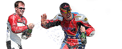 - AFM 2005 round 8, Infineon California - I was more nervous about this weekend than any other I have ever prepared for. We’ve been up against some baffling challenges this season. Some we took on ourselves, some we created ourselves, and others we could only do our best to solve mainly on our own. Mike Harmon deserves the mother load of any credit due to our successes this year. Through some twilight zone type adversity, Mike has always been there to face it head on. And even though our bikes were ready early this time, come Saturday morning we still met some set-backs. The 999R stopped charging, and the 749R sprung an oil leak. So all day Saturday, on both bikes, we only managed about fifteen laps of practice. For me, when I hear bikes running around the track all day and I’m stuck in the pits with my thumb up my nose, I get the earie feeling we’re falling behind the eight-ball, like everyone else is out there finding tenths of seconds, while we are busy losing them. And that’s exactly what we were doing on Saturday. So Saturday night at around 3am, I found myself staring at the ceiling of Craig Grantham’s motorhome. All I could think of was the problems we’ve consistently faced this year, combined with the fact that by tomorrow we couldn’t afford one single hick-up or the Open Twins championship would surely be lost. Sleep was no where in sight, so I went for a walk outside in the chilly night air. I thought about our team. I thought about commitment. I thought about the opportunities it’s far too late for us to realize now, and planned new ways to realize the ones we still can. I thought about crashing in Formula Pacific in our last Infineon appearance. I remembered the feeling of our front brake lever coming to the stop while breaking for the chicane so many races ago, falling to my knees in the dirt, and then watching Pfeifer strive on to take Aprilia’s first Open Twins win for 05. I pictured Barbara shouting into my helmet, and pointing to the smoke coming from our exhaust. I remembered hugging her, in thanks, for most likely saving my ass. I pictured that oil line bolt, torqued, and safety wired, but yet still pumping oil from the compression washer like a severed artery. Finally, I considered how fragile a championship run can be in a year, and yet how important they are for your year, to win. Three o’clock became four o’clock, then four o'clock became five. I don’t even remember blinking, never mind sleeping. Sunday practice on the 749R went well. Mounting a new set of Dunlop tires on your bike is like throwing a new Superman cape over your shoulders. Their tires are simply inspiring to have beneath you. But the big bike never made practice. Still, it sat, waiting for the answer to another puzzling question. Open Twins began with the drop of a flag, and the vision of Bud Anderson disappearing from my view. Schwannie too. But there was this one character on another Duc, that never went away. In fact he beat us to turn one. I love new sights, but this particular sight had yellow plates on it. I loved that even more. I remembered leading my first race. It felt lonely up there, with no one ahead of you. No one to follow. No one to hunt. His line into turn two was a little shaggy, but his bike came to life on the way to three, so we didn’t get by. In fact we didn’t get by until turn four. I don’t know his name, but I do know we’ll be seeing more of this guy. And I do know he was on a new Ducati. I love that the most. Schwannie kept himself pretty close. I could tell by Mike’s pit signals. When he holds his hands together, or pretty close, I know I’ve got to put the hammer down. And he had them pretty close for quite a while out there. I believe we’ll be seeing more of Schwannie as well. The bike ran flawlessly, thanks to all Mike's hard work during the weeks that led up to this weekend's race. Without his commitment we'd be running around aimlessly, and we'd never be winning. The bike ran flawlessly, and the tires worked perfectly. We went on to win, after gapping Schwannie in traffic. Somehow, getting that checkerd flag seemed surreal to me. On the cool-down lap a tear came to my eye. I even rode off the track I was so relieved. The victory circle was a welcome place to be again. Being together with Schwannie and the Cheeky Dragon up there was great. I wish the p-a system worked better. Usually all I hear afterwards is that no one could hear a damn thing. That’s ironic, because when you’re up there all you can think about is not forgetting anyone, and in the end it didn’t matter anyway. Our helmet still smells of champagne. Formula Pacific had me shaking in my Sidi boots again. I hate the proposition of going out to do better than everyone else, when you’re the least prepared of any of them. Seems irresponsible to me. By second call the bike wouldn’t start. Dennis pulled his Audi to the nose of our 999R, and the guys jumped it with cables. Turns out the answer to the puzzle may just be the starter, so we might be better off by Buttonwillow. We started on the second row, got a pretty good launch, and went into turn two in sixth. Surprisingly we kept a decent pace with those guys. Not great, but it was promising considering we haven’t had more than thirty total laps on that bike in the last three months. On the fourth lap my right foot fell off the peg after I flicked it right for turn three. Since the bike was leaned over to the right, my foot and leg had no where to go. Because I push down real hard on the pegs to turn the bike, now, without my foot on the peg, my body simply fell toward the ground. My entire leg ended up dragging behind the bike, next to the rear tire, and my chest was pressed into the tank. The bike ran wide as we crested the hill, but we managed to stay together and press on. Coming out of the carousel I took a moment to curse myself for making such a stupid mistake. But on the next lap it happened again, in just