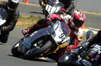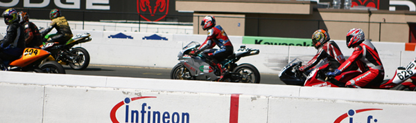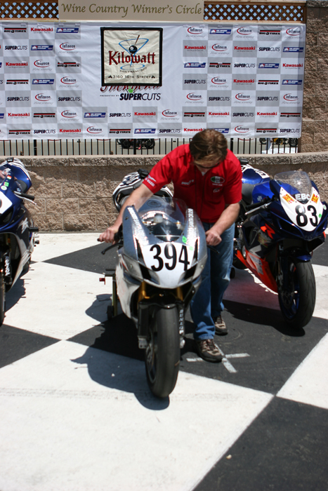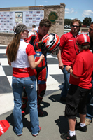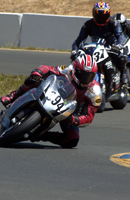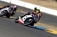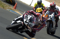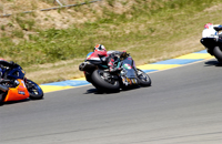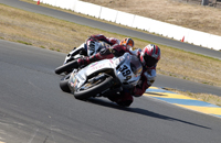 We went into Sunday a little shy about the new workload we had taken on. Four races on two different bikes is a helluva challenge. First up was Open Twins. We started on pole, which at Infineon means you're lined up next to a wall which is on your left, and then you have four other bikes to your right which are all aimed at the end of that very same wall. Since turn one is a left hander you've either got to beat them all to the end of that wall, or you're getting shut down and sent back to somewhere around tenth. In each of the THREE starts this Open Twins race took to complete (two red flags caused the re-starts), our 749R made it to the end of the wall first. But just because we took the hole shot, this didn't mean we were suddenly on easy street - apparently - because Craig McClean on another 749R came under us going into turn two on the first two starts, and then Bud Anderson threw it up underneath us on the last re-start. I guess I need to work on that section.....?