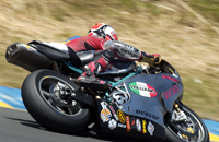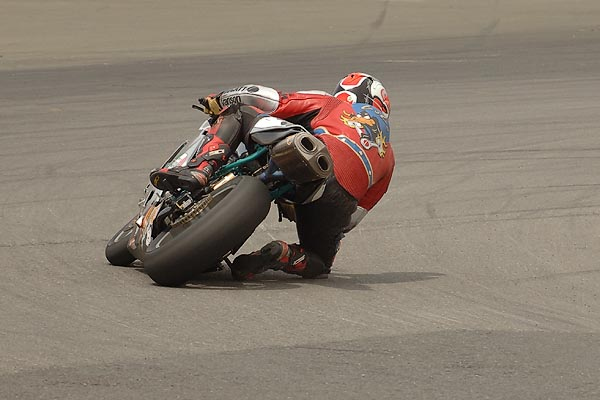 Knowing we had a real "Dry clutch" now, we went into the race with good confidence. It's amazing how different the 600's sound on the line as they await the drop of the green flag. It's almost deafening being surrounded by these high pitched howling bikes, as just about all of their motors stand there bouncing off their rev limiters. We kept our composure, and stuck to our typical launch routine - one foot on the rear stand spool, chest over the tank, finger on the brake, and clutch lifting the seat as it burns. In what felt like an instant in time our 749R came to life with an attitude I've never experienced before. Surely this was one of the best launches we have ever gotten. We went from 22nd place to fifth place by turn two (which is about 300 yards). From there, and before the end of lap two we had made it to third. With the leaders still in sight and our new DynoJet Quickshifter installed, all we had to do was keep it pinned and click up-shifts. Boy does this save loads of time and energy. It definitely made us faster, and by lap three we were right on the leaders - Jeff Tigert and Bobby Fong. We got a real good drives out of our brand new 205 Dunlop slick, which on one lap put us right in the middle of a shoulder to shoulder 600 superbike sandwich on our way up the hill toward seven. No kidding, the three of us were elbow to elbow, throttles pinned wide open, banging through the gears.... And so the challenge was on. "Who's gunna be the last one to brake...?" Surprisingly I think it was us who got into the brakes last, as we nosed our way toward the tight right hander - still in the middle and just barely in the lead. But Tigert was still homing in on our inside as we headed for the apex. I like Jeff, so we gave him a few feet off the apex (to be extra safe), and sure enough he took it like a dog takes to a hefty beef dinner bone. But everything was cool as I knew where we were strong, and the race was still young. An instant later the red flag came out and we were instructed to stop on the track. We all let-up, and slowly I rolled to a stop next to Jeff, with Fong on the opposite side. In a moment the rest of the 600 field rolled up and everyone shut their motors down. As Jeff and I celebrated the
