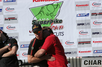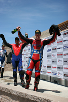We kept pretty composed and went to work on the rest of the field through the following sections, taking advantage of our 999R's excellent drive out of turns, and unique ability to run itself right around most others in a turn. By the end of the first lap, while going through start finish for the first time, I actually thought of Dennis and Matthew. Without counting out loud, or using my fingers, I could tell we had made it even a bit beyond our goal of reaching the top ten. In fact we we had made it to eighth by the end of lap one. In the following laps we passed others mostly on the brakes, or with better drives out of the particularly difficult turns on this track. We were definitely jamming in what turns out to be the very first race for this 999R. With two laps to go I set us up in the draft of the second place bike, Robert Campbell. As we headed up the long hill to turn seven we managed to sneak up his inside and make the pass for second - leaving only one more bike between us and the checker. On that same lap we dove under Garry Combs into turn eleven, and lead the field through the last lap of seven - to the checker!!!