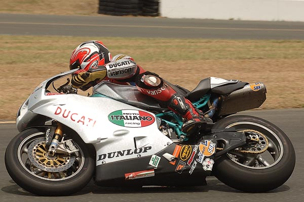 We won a great middleweight GP race a bunch of years ago, back in 99, on a Ducati 748 that was so stock it still had a horn mounted to its triple clamps. In that race we were under-powered, out-gunned, had to come from behind, and knew all bets were against us. Somehow, though, that little 748 clung to the tail end of the lead pack all race long, and on the very last lap we made it all the way from fifth, to first, and stole the checkered flag by one half of one wheel...