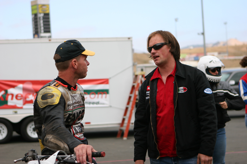 In the AFM they make you stop on track in a red flag situation. We got our red flag in turn seven. Everyone stopped, while I rode off track on what felt like a sea of Nascar pavement. I think I just needed a break for a second or two. When my eyes un-crossed from witnessing the carnage, I headed back to the pack and parked our 749R right next to Ken Hill and his Honda. Ken doesn't say a whole lot. He kind of reminds me of my father. I told him this was the maddest race I had ever been in. He agreed with great enthusiasm. But then I thought to myself, "Jeez, if Ken thinks this race was crazy, and all that happened to us happened behind him, then what the hell was going on up front?!!?