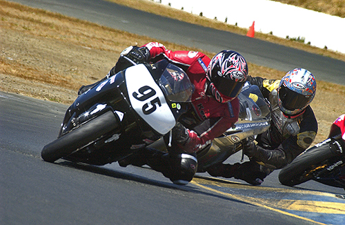 On the re-start we did better. I think we went into turn two about tenth. Now the race was "On." Our amazing 749R did everything right. We went inside riders when we needed, stayed outside when outside was smart, and powered our way through the middleweight Superbike pack. On what felt like the fifth lap of eight, we made it to a break in the traffic and really put the hammer down. I could see three riders on the horizon. One was Grant Riggs, with a gap to Ken Hill, then I could see one rider just behind Ken - stalking him. These two were fighting hard, which tends to slow you down a bit, so I kept us focused and got us real close to the action. We all went into turn seven like a freight train - each of us just a heart beat off the others rear tire. Just then Ken and this other rider went into the esses just after turn seven - side by side. And believe me, there's only room for ONE bike through there. I kept us one bike length back from them, anticipating that neither of them knew we were there, and planned to power over the wheelie hill out of the esses and out-break Ken's stalking rider into the chicane. That plan worked out real well because our Ducati has a real good set of legs on it, and super strong brakes. This pass was for fifth, and put us right on the back tire of good ole number 95 - Ken Hill....
