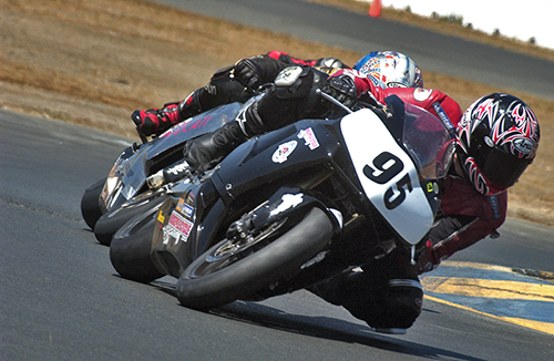 We started way back in 21st spot. Definitely an ugly place to start. It feels like 400 bikes enter 600 superbike. On the warm up lap bikes are everywhere. And when there are that many bikes in one race, well, you better be on your game because "things" are gunna happen. And things did happen. Off what became another remarkably average start, we entered turn two somewhere near 15th place. Not good. As we all crested the hill into turn two, one rider in the mix just up ahead high sided himself. With bikes so close together like they were, another guy went down with him. This other rider was about four feet off our front tire, but luckily for us we were parked just inside his rear tire, so we just kept our eyes on the horizon and stayed in it. We got a few guys in the technical stuff, but still I felt haunted by that nagging AFM crash rule, so we really had to tip toe around. By the third lap we had made some good progress. It feels like we were about 7th or 8th when we all jammed down Infineon's front straight to start the fourth lap. We were the third of a tight pack of three going in to the fast left hand sweeper at full tilt. Just then the lead rider of our pack lost his front and fell immediately. The rider just in front of us checked up as quick as he could, but he had a hand full to deal with. The fallen rider and bike had him surrounded as the three of them headed off line. When the bouncing motorcycle snapped up and hit the avoiding rider just in front of us, it sheared his bar right off. Just then the struggling rider fell to one side, with his chest hitting, then sliding off the tank like a clean cloth slides off the hood of a freshly waxed Chevy. He had no chance, and fell off immediately. Now we had two fallen riders in front of us, and two motorcycles careening out of control. I tugged in on the front and rear brake as gently as I could, while clinging to the hope that we could actually still make turn one. The second fallen motorcycle hadn't actually fallen yet, and was instead ghost riding across the track. I kept us in the struggle to ignore all this madness, while focusing on turn one, and we made it through. As we crested turn two I expected waving red flags. They flew shortly after. Turn one is not a good place to crash at Infineon. Fortunately, though, we later learned that both riders made out quite well. No serious injuries.
