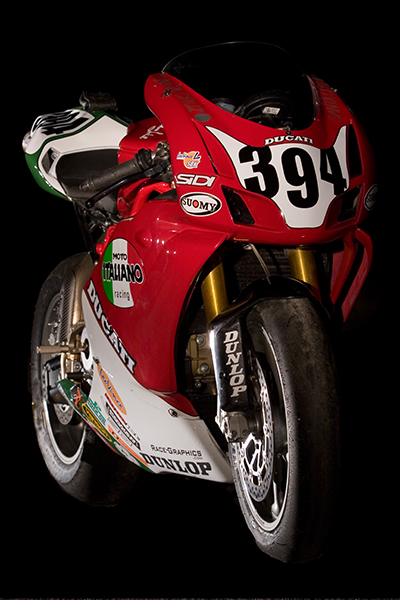 If there is another good thing about crashing, it's the opportunity you get to create a new paint scheme! And boy oh boy, did Jason come through with a great idea for our new 999R. Since the silver 749R is modeled after the "Paul Smart", Jason decided to go retro on the big bike as well. He had our new paint sponsor, Allstar, in Santa Cruz, turn our 999R into a classic F1 replica. And what a beautiful job they did.