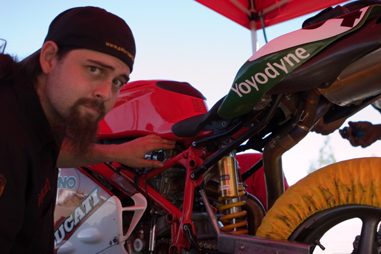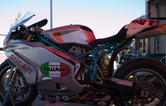 As we shot down the left side of the straight, virgin dust that once covered the track surface billowed from either side of his bike as we both shot through the air just as fast as our machines would carry us. I just held my breath and kept it pinned. But still we couldn't quite match his pace down that back straight. Each lap we'd lose a few lengths, but then we'd rail through Riverside at a really good clip and make it all back up. Twice we came around his outside through there as we set up for what I knew would be a ground shaking pass into the bus stop (a bumpy third gear curb to curb flat out turn that bends it's way right in front of the stands). But I didn't show him our front tire. I was saving it for the white flag lap. And THAT was my mistake. I should have been more aggressive. I should have gone for it early enough to maybe rob some air off the second place rider, Grant Riggs, on the next lap. This could have helped us put a gap on Hill, which would have kept him out of OUR draft. Instead, on the fourth lap I noticed our dash flashing three big black numbers - 261. That was our temperature. Not a good number to see. And just then our champion of a 749R began to stumble and surge. Turns out drafting Ken, and not getting any fresh air for ourselves, got us to overheating. I knew we wouldn't suffer the same water on the rear tire fate that got us wrecked at T-hill this year (full story here), because the boys have rigged up a nice overflow system to avoid coolant going where you don't want it. I stayed in it and kept our nose in clean air to bring her home in a not so distant 4th. Not a bad showing at all for the last chance we'll ever get to ride this wonderful Ducati. But I would have loved another chance to play out a different plan. Good job Ken. And bye bye to my favorite race bike of all times - the "Giant Slayer" 2005 Ducati 749R