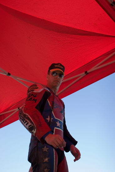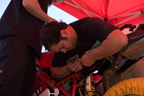By late Friday afternoon we were at speed again, and things were finally going better. I wouldn't say we'd found our "Rhythm" but we could at least hear music coming from up ahead. I was hungry. And the Bull was alive and well again. The boys had done it, and I was anxious to call back after just one more lap with the good news. Just then, while coming out of the second gear Mazda turn again, I heard the angry roar of this motor spin up way too quick. Instantly my feet were overhead, my chin hit the windscreen, and the Bull was checking out. But I didn't let go. Instead I tried to roll out of it only slightly while hovering overhead, and hoped we'd get a chance to make it out of another tough scenario. In the next moment the bike rose back upright, underneath me, and I landed back on her - sitting nicely in the middle of the fuel tank, and on the gas again.