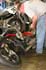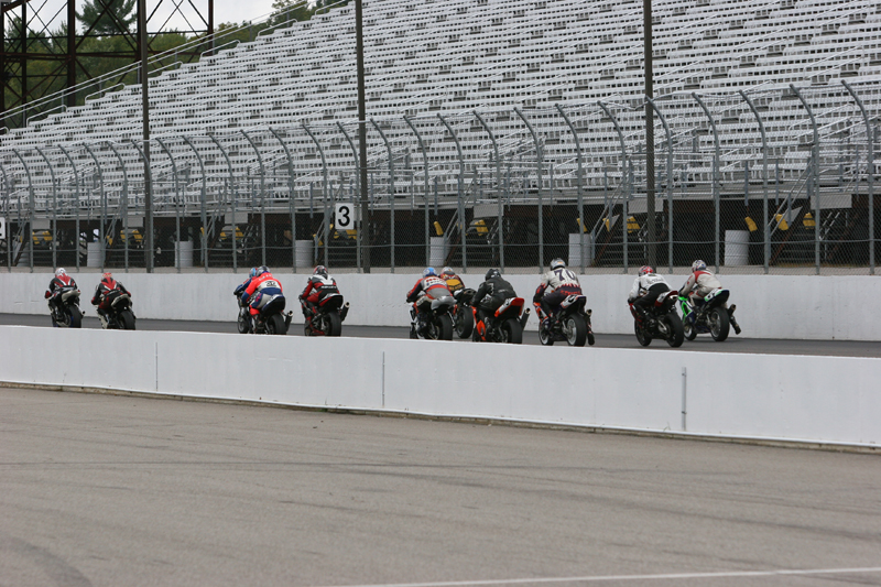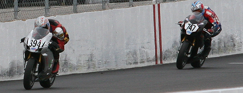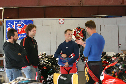 - Heavyweight Superbike - We had a team mate when we raced on the east coast. His name was Tommyboy Eckfeldt. We beat him every weekend. Keep in mind, though, that you're supposed to beat your team-mate every weekend - before you beat anyone else. But we also helped Tommy every weekend. He was an up and coming guy on Ducatis when we lived back in NY. Good rider, hard worker. He wanted to learn a lot, and we helped him any way we could. Tommy's father, Grant, supports their Ducati race program with everything he's got - weekend in and weekend out. When we left three years ago, Tommy battled hard just to make the podiums that we used to rule. But that was three years ago. And times have surely changed since then... Tommy has a 999R now, and he wins a lot. It seems three years without us has worked out well for he and his Dad. Still, though, they welcomed us back with open arms. Although I do have to admit, Tommy did threaten he was gunna' wipe the track with our ass this weekend. I didn't really know how to take that. I was glad to see him confident, finally, but we felt pretty good as well. What should I have done? Threaten him back? Talk a lot of smack? Get into his head? Or just let things play out...? As it turned out, just like the old track felt natural again, so did being Tommy's team mate. We ended up helping him iron out the set-up on his 999R, which he had been struggling with all year. He complained the front end pushed, we sent Joey Israel over to help him. He had no traction, we looked into his swingarm angle. When we noticed the zip tie on his forks was pinned at the stop, we told him. When he responded by saying "I know, I know. It's always like that." We made him get off his ass and get them re-sprung. But still, even though our communication was open, when it came to riding, Tommy was very different out there. We used to go out in practices together. Now he hid from us. Now he went out before I even had my helmet on. And he was pretty tight lipped about things when we got back to the garage. There was definitely something strange in the air. Not Tracy, Derek, or myself could put our finger on it - but if you took either Tommy or us to the side and asked, we both would have admitted "The fight was on." Tracy stood on the hot pit wall for our first race (Heavyweight Superbike), next to Derek, and next to Grant. Emotions were peaked, nerves were highly visible, and the sound of the heavyweight superbike field lining up ran through everyone's blood like electricity. We were gridded on the 4th row. Tommy was on the 2nd. He's run strong in this class this season, with two wins under his belt for the year. We were nobody to most of the guys we lined up next to. Just a strange sounding silver bike that looked like a disco ball, and a foreign rider with his left toe jammed on top of his swingarm spool. We got a good launch and quickly made our way into third by using an old trick through turn one - keep it wide open till your nose bleeds, then jam it up the inside of everyone going into two.. It worked very well. On the brakes going into turn three we made our way into second. Our 749R was up to its old tricks again - taking on the big bikes in a class it has no business running in - and doing it with style.