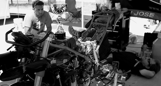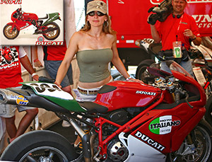Round Five wasn't going to be any easier as it turned out. The heat was just as bad as the previous round. So too, were our overheating problems. Only on this weekend both bikes were running hot. In fact just about every bike on the grid was experiencing a high fever. But this time Jason and Scotty had a plan. And it worked. Although the bikes did run hot at times, neither of them were losing any water so our fear of another wreck subsided. But it turns out those fears subsided a bit too soon. We wrecked twice that weekend. Once was my fault. Apparently I wasn't happy being arguably the fastest bike over the top of the cyclone. I wanted to jump the damn thing. And so I did - only I landed on my head instead of on our wheels. When the boys threw the first bike back together in almost no time at all, I decided to go out and do it all over again in the SAME DAMN TURN! Only difference this time was I threw her down on purpose - to avoid wrecking into two other guys who had tangled off track, and then back on again - just in front of us! I have to say, trailing the front brake while you're eyeing up a line that's about to put somebody's clip-on in your throat, is not a very comfortable moment. Even though I was already sore from the crash just before, I chose the pavement over the clip-ons. ![]() We came home to a mail from Ducati North America in Jason's box. That mail asked if they could have at least one, if not both bikes for the Ducati Island display at Laguna Seca, during the MotoGP weekend.