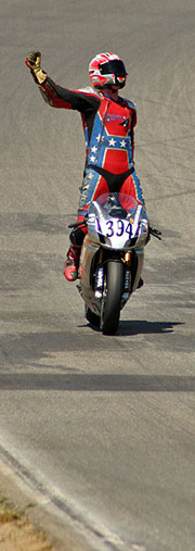 But then suddenly my years of avoiding baseball's infamous jynx caught up to us, and superstition made it's mark. Our back tire stepped out while going into turn seven so I pulled in the clutch and straightened out for an instant. The motor immedietly died. When I bumped it back to life it did fire again, but it was only half there. We motored out of seven with lots of hope, and still in the lead, but I could hear the motor making unhealthy noises now. I knew we had too many laps left to nurse her home, so we pulled out and I put our 999R to sleep in the weeds, in defeat. Our no hitter had ended. And to make matters worse, McClean got passed by Parriot on the last lap, leaving the best finishing Ducati to finish in second place. Not where Ducati belongs at all.