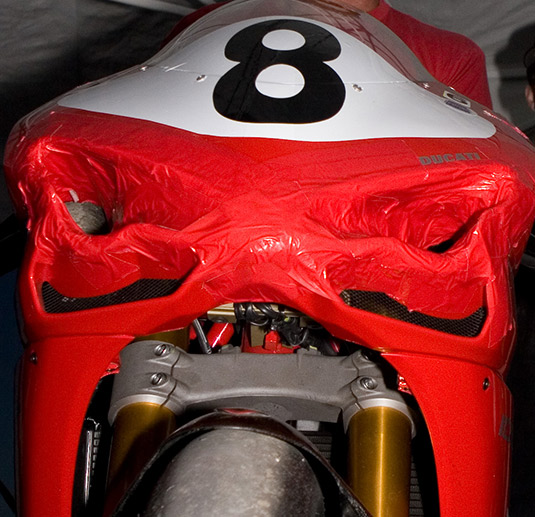 3/25/07 AFM round 1, Buttonwillow racetrack __________It’s 1982. At fifteen years old I am painfully shy, reserved, yet hungry as all hell. It’s 80% through lunch period and by now everyone has abandoned their trays and gradually, strategically, packed themselves around the perimeter of our schools lounge. Lounge perimeter represents a safety zone that quietly promises the weaker kids little more than a chance to survive the overwhelming pressure of their peers. At fifteen I’m all about survival. I sit in the back of every class, keep a low profile, and only speak when I’m spoken to. I’m definitely a perimeter kid when it comes to the lounge. With ten minutes to go until the bell flushes this hall of fear, the very same desperation that has so effectively trained me to dodge the spotlight, to avoid all eye contact, and to always face the borders, is overwhelmed by my uncontrollable gaze toward center stage. It’s our school’s prettiest girl who enters, and innocently perches herself precisely at the core of what for me would represent a bone crushing force of critical focus, unwanted attention, and painful insecurity. Her name is Tara. For me, she single handedly defines beauty. Yet also for me, she is not reality. Our worlds exist only in parallel. Our paths will never cross. As I secretly watch her from among the crowd I realize this, and from a pivotal point littered by the backs of people’s heads and the thoughtless bumps and shoves of those bigger than me, I emerge from one final gaze at her name creatively etched on the back of my notebook. Today is a big day for me. What I do next defines not necessarily who I am, but how I finally gathered the courage to also speak when I’m not called on. I’m standing directly in front of her now, finally defying the very same light that I’ve always hidden from. Once she looks up to me I begin telling her things she would otherwise never understand. For once I don’t stare at her books, at the ground, or at any of the sea of other escapes I could have chosen. I only see her eyes, and eventually, her smile. Once my story is told I turn and begin on a very new journey. As I walk away from the pressure I quietly say, “F**k the light.” Since that day I’ve always told stories. Some have opened doors, others have shut them right in my face – but if nothing else they were all the truth. By definition I am still shy, but definitely NOT cagey. In racing I’ve found most people shoot straight once out on the track, but in the pits – well that’s another thing all together. I see this typical difference between fact and fabrication as a rare opportunity to share with you what’s real – and so I do... I saw Steve Crevier go through Daytona’s pit-out once with an unknowing wrench hanging from his swingarm. The instant that wrench touched the International Horseshoe’s tarmac he was launched into oblivion. And from the moment he regained consciousness - till today, I’ve never heard or read one word about that wrench. We still don’t know what caused the ever mysterious career ending crash for Dale Quarterly up on Daytona’s banks, and we are even sometimes asked to accept claims that insist a particular riders recent discovery of over two seconds per lap has nothing to do with his bike suddenly sounding like a surface to air missile launch. Surely politics are at the core of some of the bullshit. Lots of time it's pride. Sometimes a straight shot will get you shit canned in one day, so there are times I imagine when drawing the blinds could be seen as a good thing to do... For me, I don't see how there can only be good - all the time. Enter, TagTeamDucati’s 2007 AFM round 1 race report : It’s 12:15pm Sunday afternoon and not a person is in sight. The sun finds the back of my neck as my head hangs between my arms, which are stretched around my knees. My ass is parked on the very same alligator teeth that I so cautiously jumped over on our 1098 less than an hour ago. My hands are locked together, calmly fighting the warm leather and stitching that protects me in battle. I am intentionally, completely alone out there. All the corner workers are at lunch, the winners of F1 are celebrating, and none of our crew knows where I am. In a dream sequence the following memories replay in my mind: Just then a slowly approaching white pick-up truck pulls to my feet. I look up to find one of racing’s best friends dressed in white with his chin resting comfortably on his folded arms just atop the door. He quietly asks, “You OK GoGo?” Slowly my eyes draw from somewhere off in the distance, to his face, while I consider the unnecessary struggling, the one sided phone call, the momentum we had as we continued to careen farther and farther out of control, and I say, “Our team is having problems. Things are getting dangerous. I think it’s time for me to go home.” When he asks if I need a ride I accept, and as I stand I see my next best friend Barb, head of all that happens on the tarmac, sitting in the passenger seat. I thank the two of them for always taking care of me. Once back at our pit I pack up my boy, pack up my girl, and we leave the racetrack early – something I have never done in 19 years of racing, crashing, winning, losing, trying, hoping, and dreaming. I finally surrendered. But I did not surrender with the idea of giving something up. I surrendered with the idea of gaining something, of building something, and of making something better - for everyone involved. I knew leaving meant that I might never ride those bikes again. But I also knew leaving, under those circumstances, was the right thing to do. As we pulled away I watched a clutter of pit equipment pass before the red silhouette of a massive looking 1098 that I’ve been dreaming about racing for over eight months – yet that I was about to turn my back on. I thought about how good that bike felt beneath me in the only four laps that we completed 